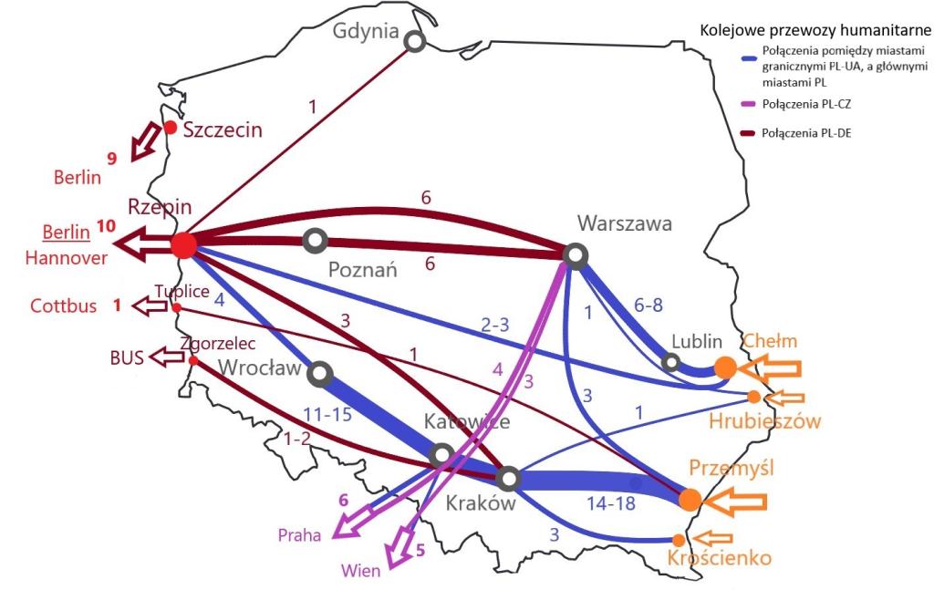 Do 16 marca br. łącznie z Polski (z Warszawy, Wrocławia, Przemyśla, Chełma i Krakowa) wyjechały 394 pociągi z uchodźcami, w tym 317 pociągów stałego kursowania i 77 pociągów specjalnych, którymi uchodźcy kierowali się do Niemiec i Czech. Przewiozły one łącznie ponad 115,7 tys. osób.