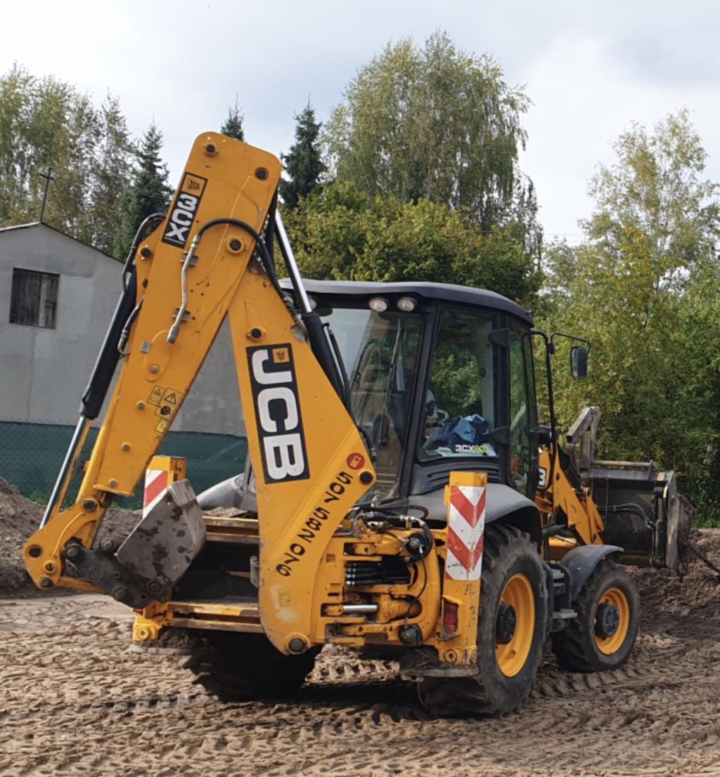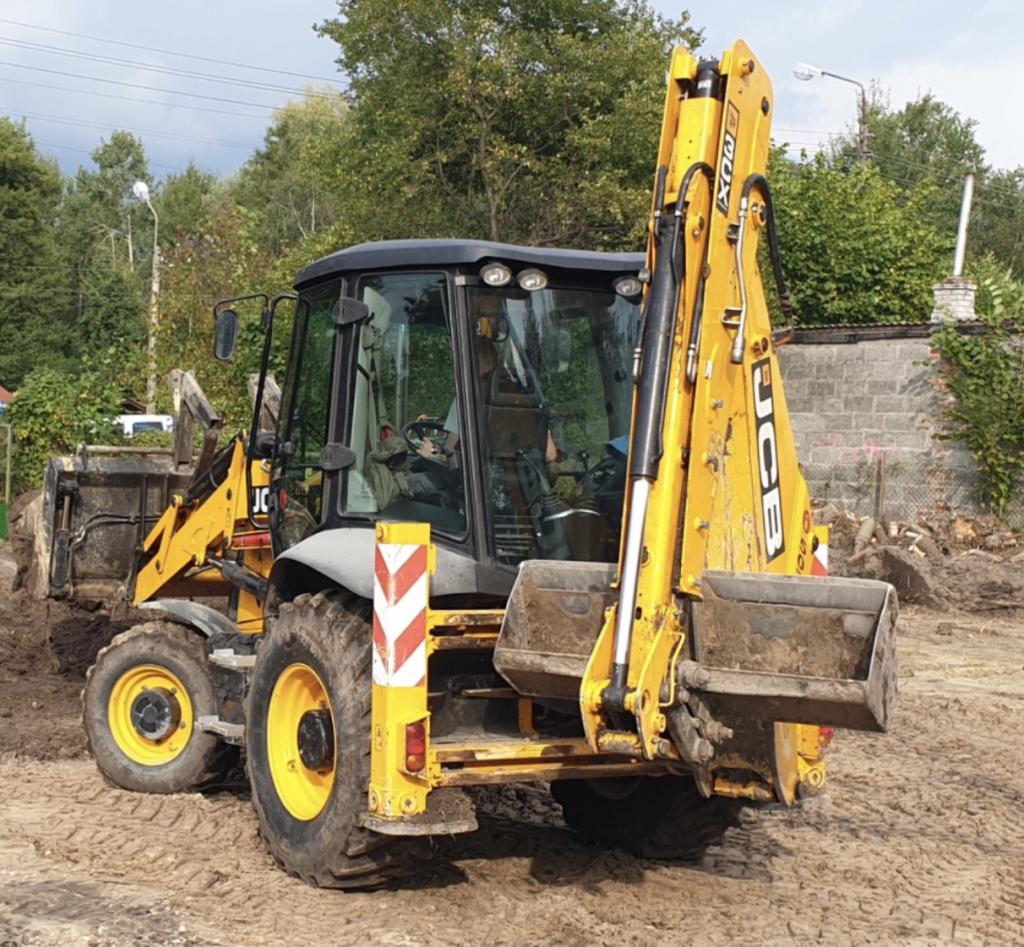 Koparko-ładowarka wraz z załadowaną na przednią łyżkę zagęszczarką była przygotowana do pracy na kolejny dzień. Została zaparkowana na terenie firmy House Technology Sp. z o.o. 05-082 Stare Babice ul. Warszawska 332.