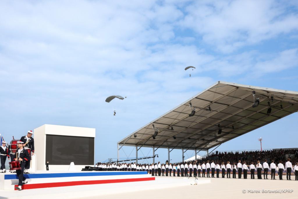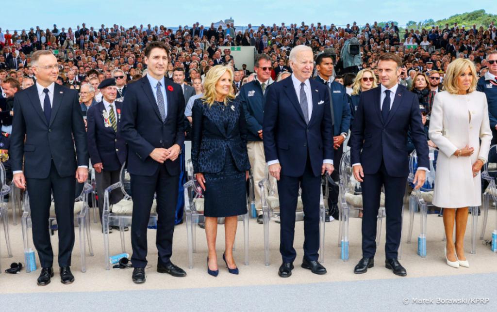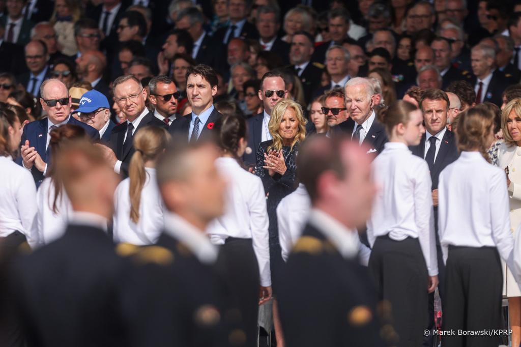 Polskiego Prezydenta powitał gospodarz uroczystości Prezydent Francji Emmanuel Macron z Małżonką. W obchodach uczestniczyli m.in.: Prezydent USA Joe Biden i Prezydent Ukrainy Wołodymyr Zełenski, a także Księżę William, Prezydent Włoch Sergio Mattarella, Premier Kanady Justin Trudeau, Premier Holandii Mark Rutte, Kanclerz Niemiec Olaf Scholz. Obecni byli kombatanci – około 200 uczestników II wojny światowej.