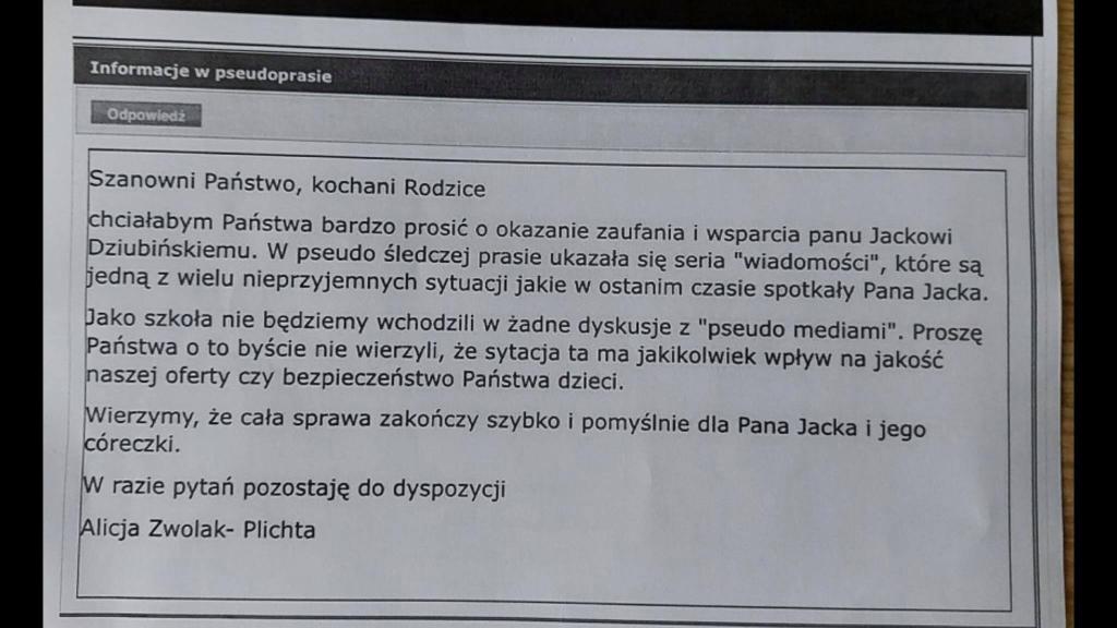 - W wywiadzie udzielonym tydzień temu Patriot24.net dyrektorka twierdziła, że sprawa jej nie dotyczy bo to "prywatny problem pracującego u niej nauczyciela". Tymczasem z maila, jaki rozesłała do rodziców wynika, że ona osobiście i emocjonalnie angażuje się w poparcie dla jego przestępczej działalności - przekazuje Agata Dziubińska.