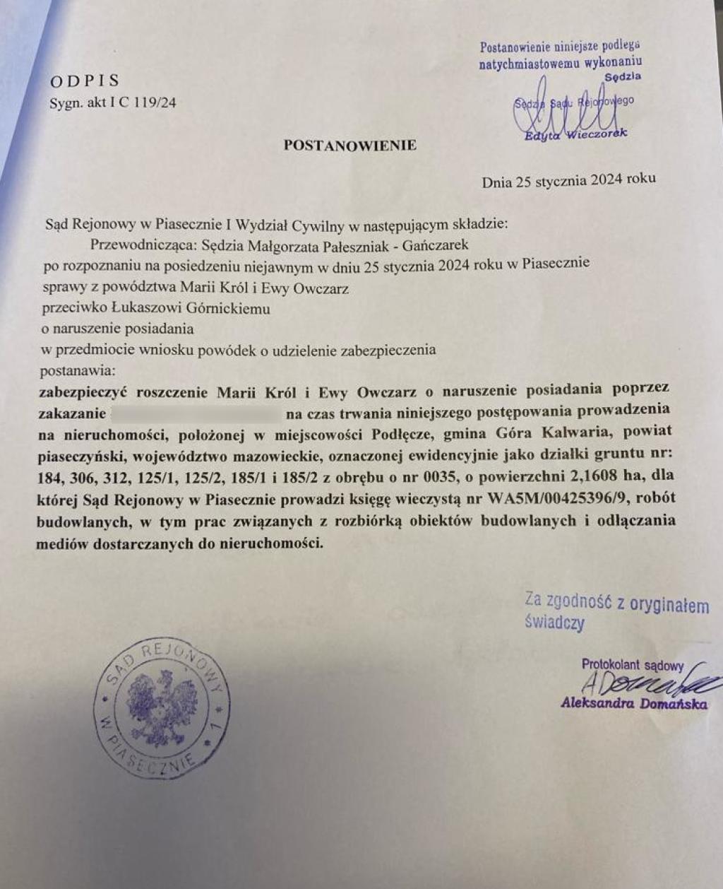 Mimo wydanego nakazu sądowego o wstrzymaniu wszelkich prac przez właściciela na terenie tego obiektu, właściciel, który najprawdopodobniej mianował się szeryfem tego rejonu za ni nic ma sąd i jego postanowienia. Funkcjonariusze policji, którzy przyjechali na interwencję nie zdołali skutecznie interweniować. Najwyraźniej słowa szeryfa stoją ponad prawem i policją i on jedynie ma rację. Po raz kolejny przy pomocy zamaskowanych "pomagierów" wtargnął na posesję i dokonywał samowoli, która nie ma żadnego innego uzasadnienia jak tylko chęć utrudnienia życia Pani Marii Król.