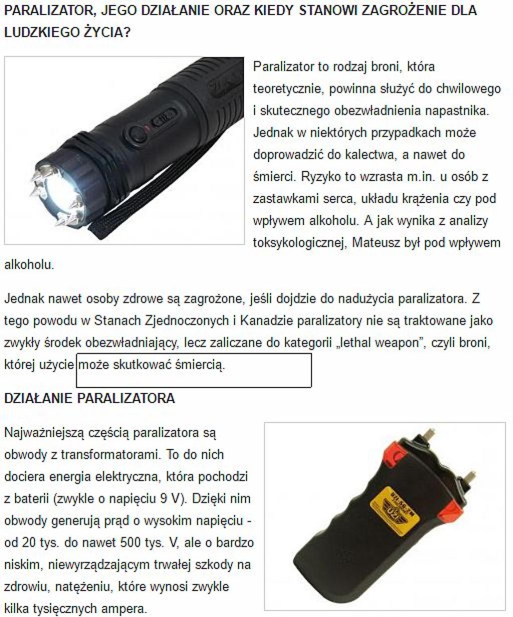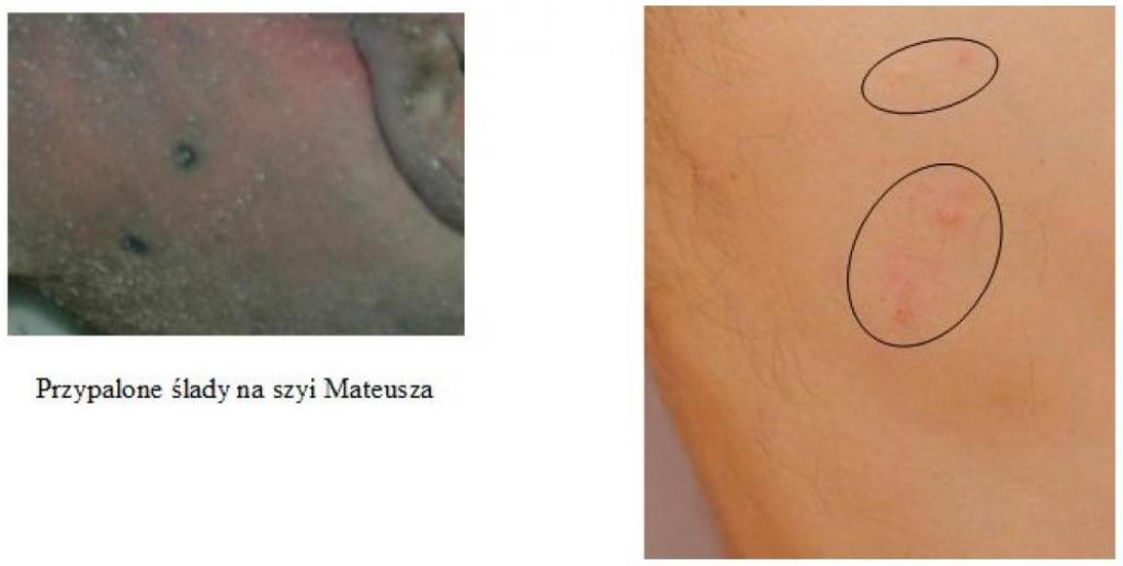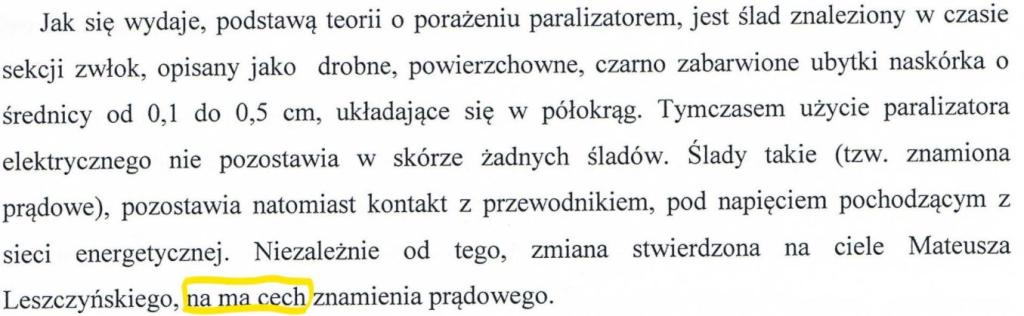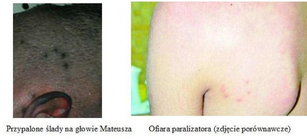 Natomiast w sposób bardzo zagadkowy krakowscy medycy odnieśli się do sprawy paralizatorów. Opisując wypalone ślady na skórze głowy Mateusza, w sposób kategoryczny, Kierownik Zakładu Medycyny Sądowej Uniwersytetu Jagiellońskiego, biegły lekarz Dr hab med. Tomasz Konopka napisał, że "na ma cech znamienia prądowego".