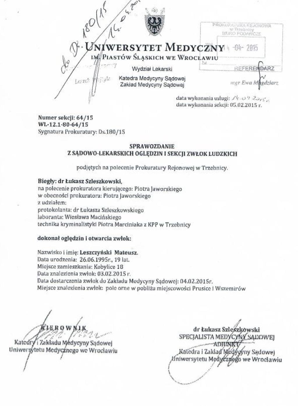 Ponieważ matka Mateusza nagłośniła poszukiwania swojego syna, angażując Krzysztofa Rutkowskiego i jego ekipę, Prokurator Rejonowy w Trzebnicy Leszek Wojtyła zarządził przeprowadzenie tzw. poszerzonej sekcji zwłok we Wrocławskiej Akademii Medycznej.