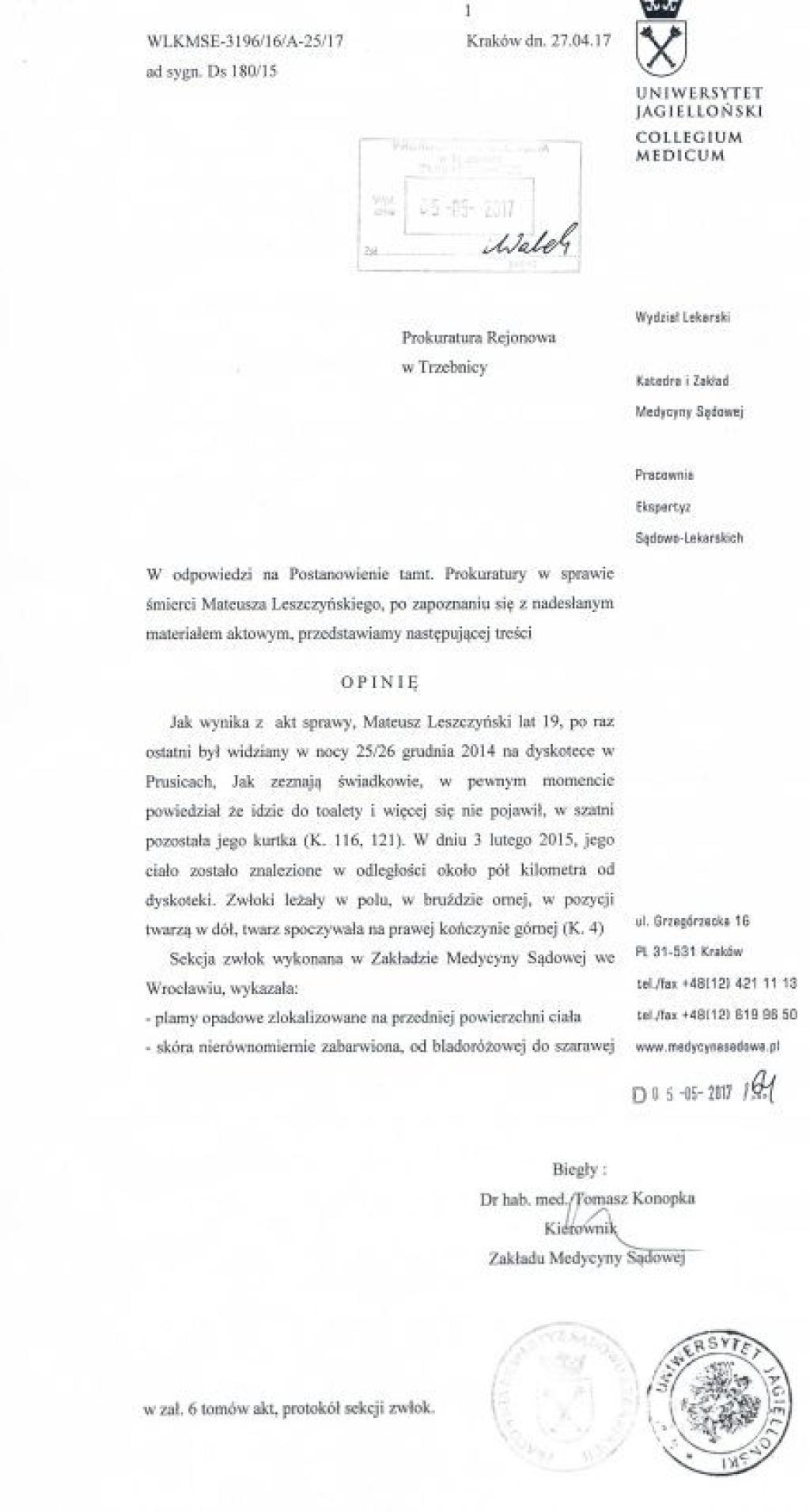 Z opinii medycznej przesłanej z Krakowa, które dotarło 4 maja 2017 roku, do Prokuratury Rejonowej w Trzebnicy wynika, że Akademia Medyczna we Wrocławiu napisała nieprawdę. Zdaniem krakowskich specjalistów nie