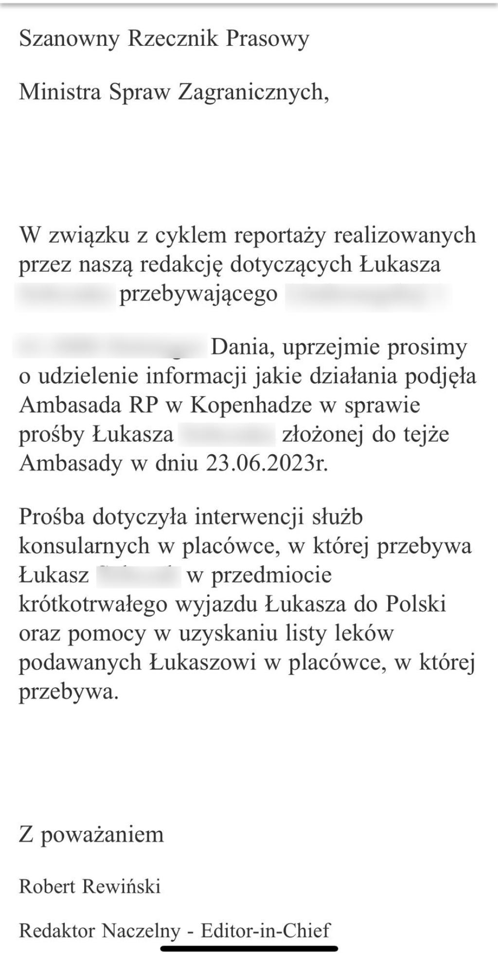 Dlaczego pan Łukasz przebywający w otwartym ośrodku terapeutycznym, nie może przyjechać na wakacje do Polski? Czy leki, które podają mu duńskie władze, wspomagają czy niszczą jego zdrowie?