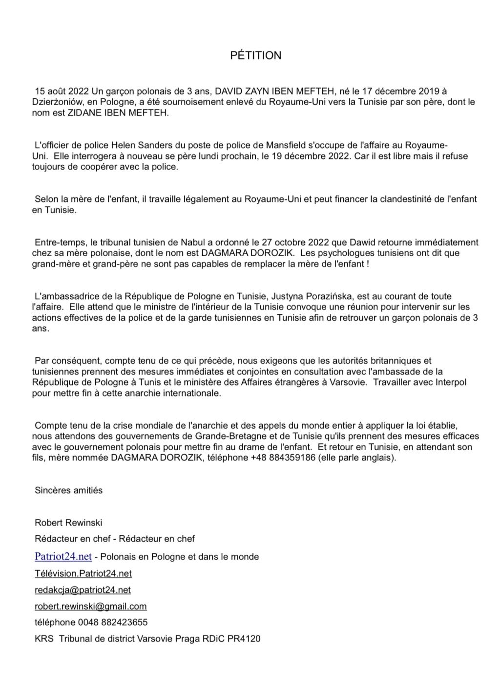Nous présentons le compte rendu complet de la manifestation de vendredi à l'ambassade de la République tunisienne à Varsovie. La police et la garde locales trouveront-elles sur leur territoire Dawid, 3 ans, qui, en vertu du jugement du tribunal tunisien de Nabul, doit retourner chez sa mère polonaise Dagmara Dorozik ?