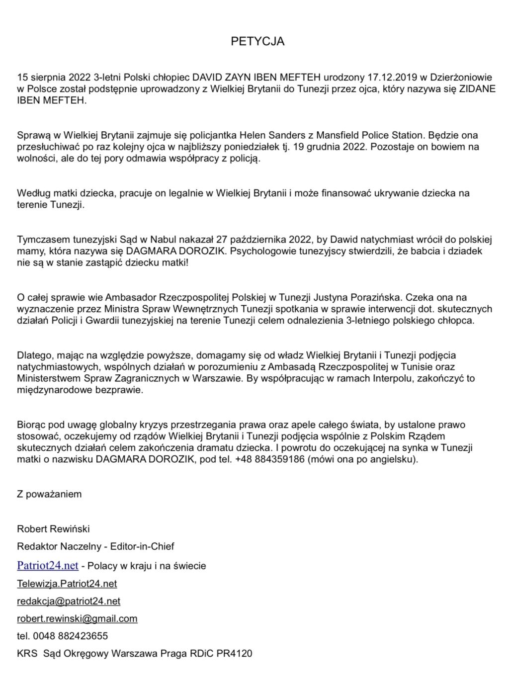 Nous présentons un enregistrement vidéo de la manifestation d'aujourd'hui à l'ambassade britannique à Varsovie. Le gouvernement britannique, la police et le roi Charles III, en coopération avec Interpol, vont-ils récupérer l'enfant polonais enlevé le 15 août 2022 d'Angleterre vers la Tunisie ?