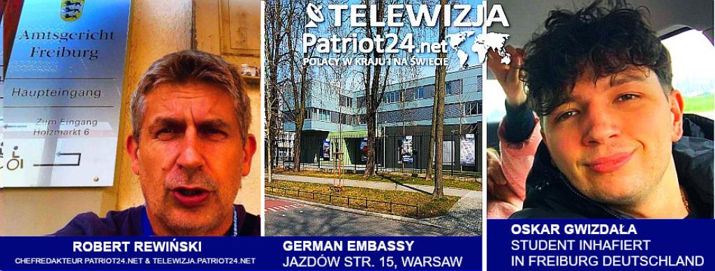 Heute Nachmittag zeigen wir auf unserem Portal Patriot24.net und unserer Plattform Telewizja.Patriot24.net sowie in sozialen Medien deutschlandweit einen Videobericht von der Demonstration vor der Deutschen Botschaft in Warschau. Sie beginnt um 11 Uhr und endet mit dem Versuch, dem deutschen Botschafter in Polen eine Petition zu überreichen, die Diskriminierung, Achtung des Rechts und Freiheit polnischer Bürger in Deutschland betrifft.