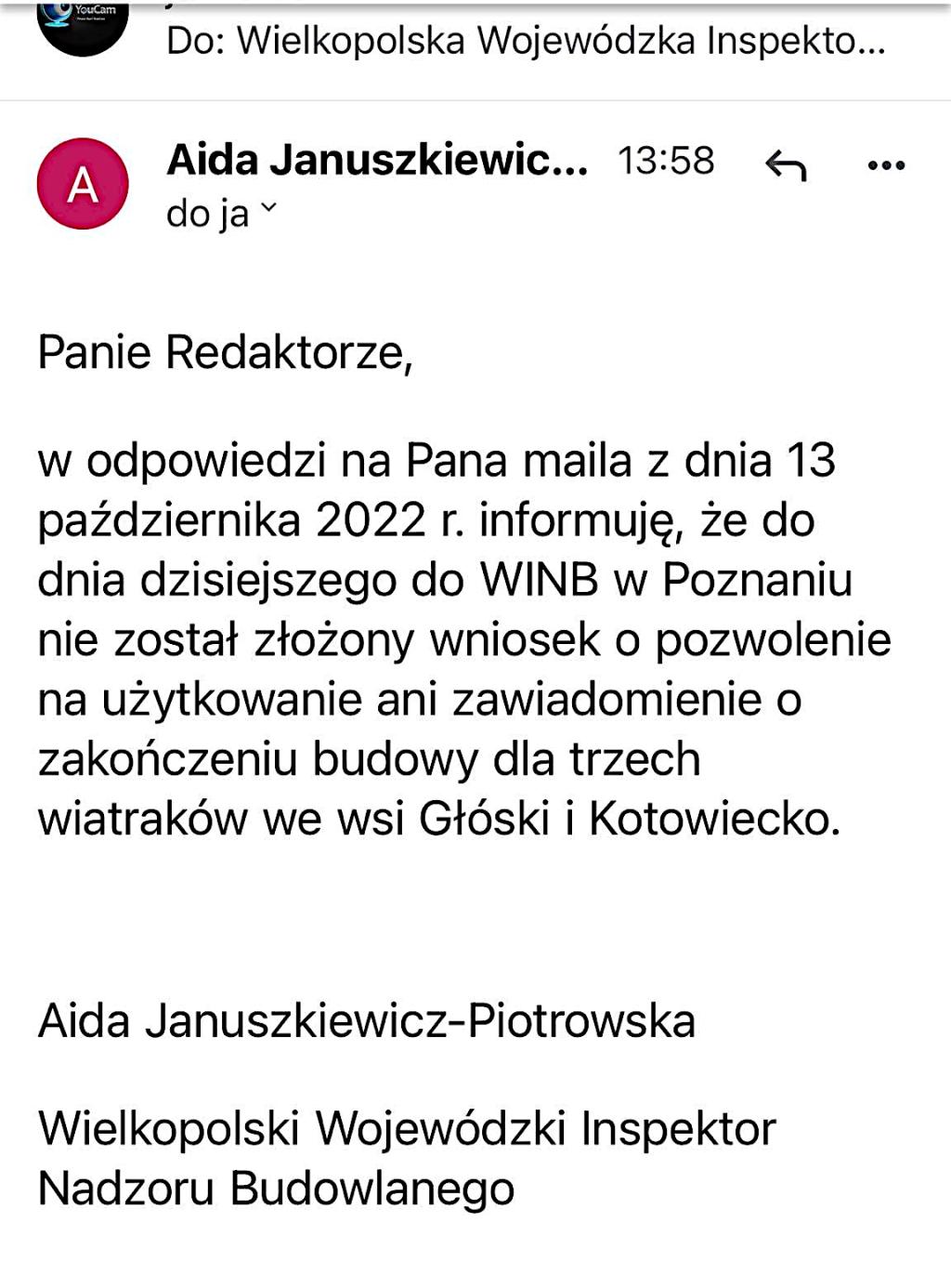 2. Informacji uzyskanej dziś w Wielkopolskim Wojewódzkim Inspektoracie Nadzoru Budowlanego iż przedmiotowa inwestycja to jest 3 wiatraki we wsiach Głóski i Kotowiecko nie zostały formalnie odebrane przez Wielkopolski Wojewódzki Inspektorat Nadzoru Budowlanego w Poznaniu bo nawet inwestor czyli „Park Wiatrowy Kalisz Północ Sp. z o.o.” nie złożył dotąd wniosku o ich odbiór