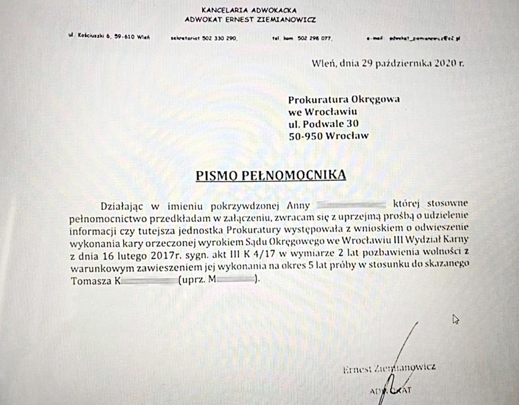 Z drugiej strony wrocławska prokuratura do tej pory nie wystąpiła do sądu o odwieszenie Tomaszowi K. wyroku więzienia z roku 2017 r.