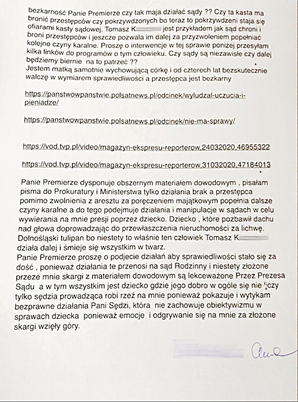 - W piśmie o sygnaturze BJK.572.2.4.2020 MK czytamy, że biuro wicepremiera Jarosława Kaczyńskiego przekazuje do biura Ministra Sprawiedliwości wniosek o nadzór nad sprawą Tomasza K. Zwraca się też o dokonanie analizy sprawy i przekazanie ustaleń do biura wicepremiera.