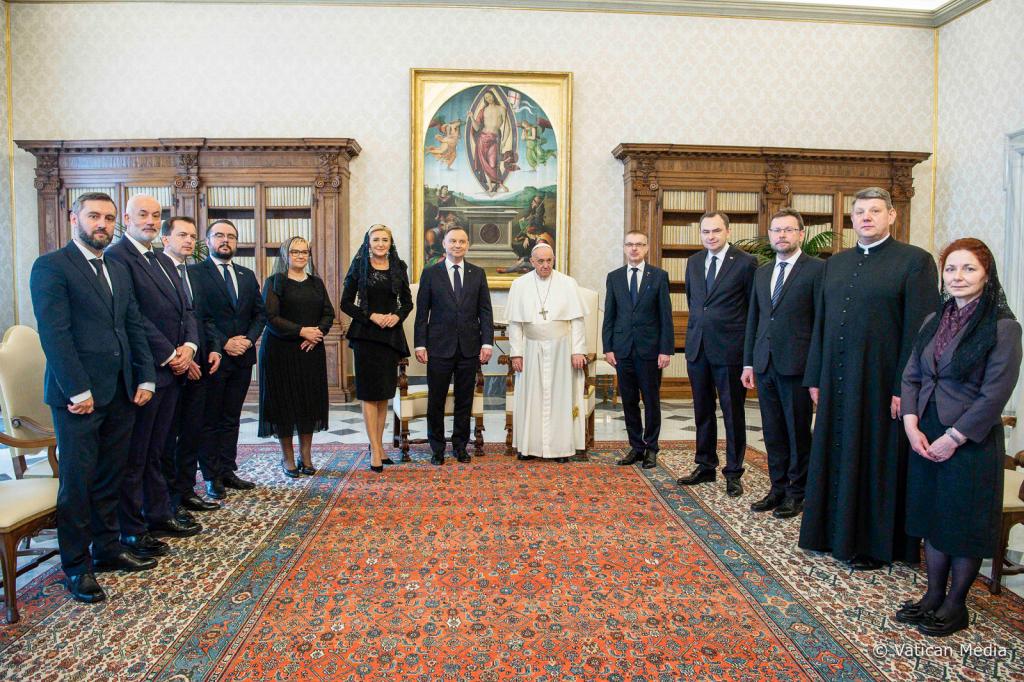 Prezydent Andrzej Duda z Małżonką Agatą Kornhauser–Dudą zostali przyjęci na audiencji przez Papieża Franciszka. Rozmowy dotyczyły głównie sytuacji związanej z wojną na Ukrainie.